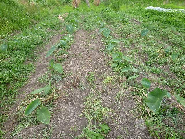 もう少し里芋が大きくなると、管理機を走らせて土寄せ兼除草もできるんですがまだ小さいので、ひたすら手作業です。