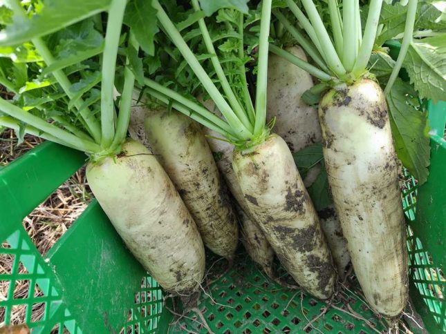 大根始まりました。葉が虫食い少ないのと箱に余裕が有るので、大根は葉付きでお届けしてます。葉はジャコと炒めてふりかけにすると美味しいです。