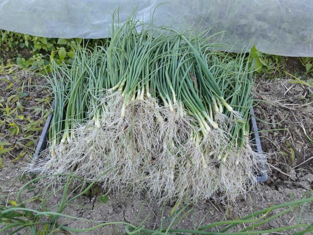 上の写真は玉ねぎ苗。苗床から採って下のように植えてます。