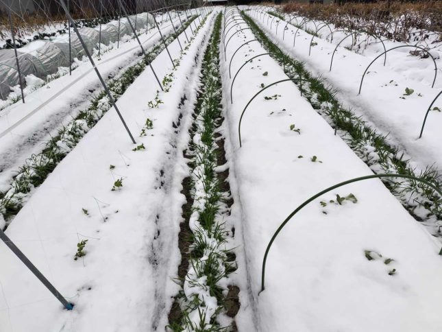 日曜日は雪でした。殆ど積もることの無いエリアなのでタイヤも夏用だしいろいろと大変です。一番困るのが、野菜の収穫。雪の中で収穫して良いものなのかどうかの判断するのが経験乏しいので迷います。上の写真は月曜日のお昼ごろのもの、冬場は午前中は畑や野菜が凍っているので、溶けてる午後収穫が基本です。12時頃でこの状態だと駄目かなと迷いましたが、それから少し日が照ったので15時頃にだいぶ溶けて何とか収穫できました。
