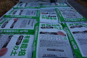 ポット苗は、自家製の腐葉土と畑の土を購入培土にミックスして使います。