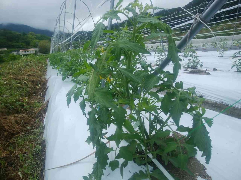 トマトはこのくらい迄育ってます。トマトの管理作業は、脇芽を取って下の方をスッキリとさせたり、ネットに上手く絡むように紐を張ったりとしていきます。