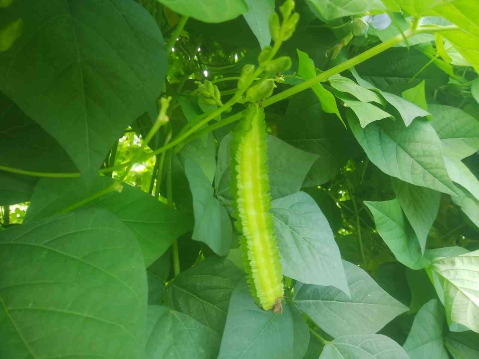 写真は四角豆です。四角豆は日が長いうちは花が落ちます。まだ日が長いので、花が落ちてるんですが、一つだけ花が落ちなくて実がついたものが有りました。多分良い吉兆です。そろそろ花が落ちない程度の日の長さになってきたのかもしれません。