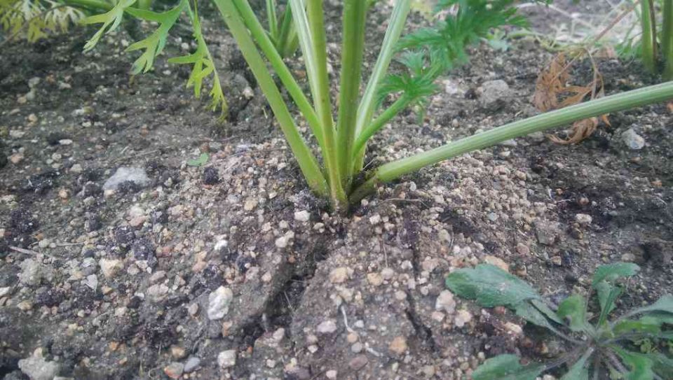 今年の特徴は、吸込み性が強いこと。人参の肩が土の中に埋まってます。これが吸込み性の人参です。人参によっては土の上に肩が出るものもあります。