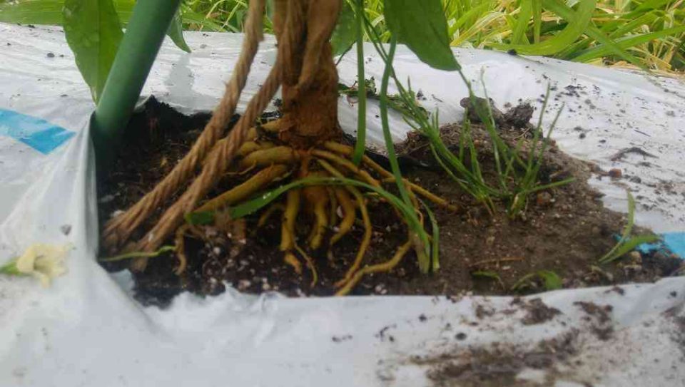 通常の栽培ではここまで根が見えることはありませんが、根をあえて出すことで幹が太くなり、立ち枯れ病の予防になると言われてます。