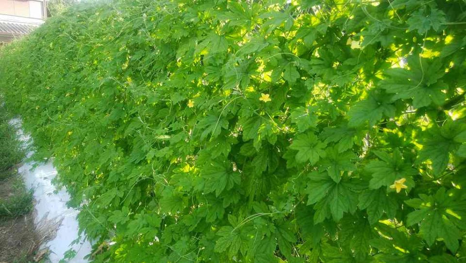 発芽が全然だめだったので、株数も少なめ。これは30m弱の畝長で、10株程度しか植えてません。でも、なんとかアーチトンネルを覆うくらいには成長してくれました。例年は1mの株間ですが。このくらいの株間のほうがゴーヤには良いのかも知れませんね。