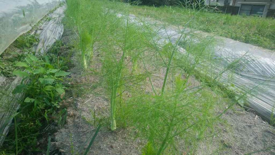 写真はフェンネル。今年初挑戦の野菜です。サラダで食べれる品種を選んでの栽培。ハーブだけあって畝に近づくとすごくいい匂いがします。