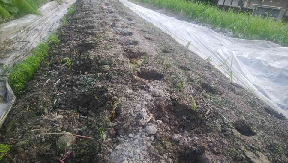 今年は太陽熱除草をかけた畝に、マルチ無しでの栽培。初の試みで、春先の草をどこまで抑えれるかが不安です。草は生えてもいいんだけど、草に埋もれてしまうと太りが悪くなるので、ある程度は抑えたいです。