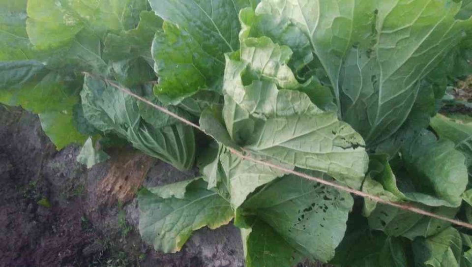 大きな外葉で白菜を包んで紐で縛り、寒さから守ります。