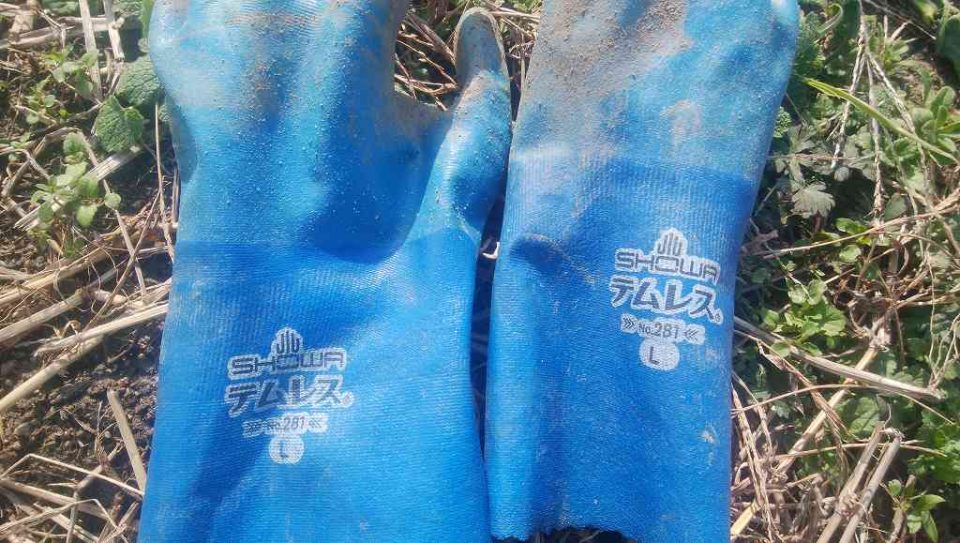収穫の手袋はテムレスがオススメ。ゴム手だけど蒸れにくいし、柔らかくて動かしやすい。あと頑丈で、破れなくて1シーズン持ちます。
