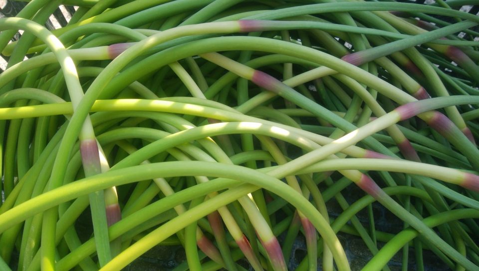 ニンニクの芽は上の写真の感じででてますそれをポキポキと折って収穫です。素手で作業してるとちょっとした手の傷にニンニクの汁が染みて痛いです。ゴム手必須です。