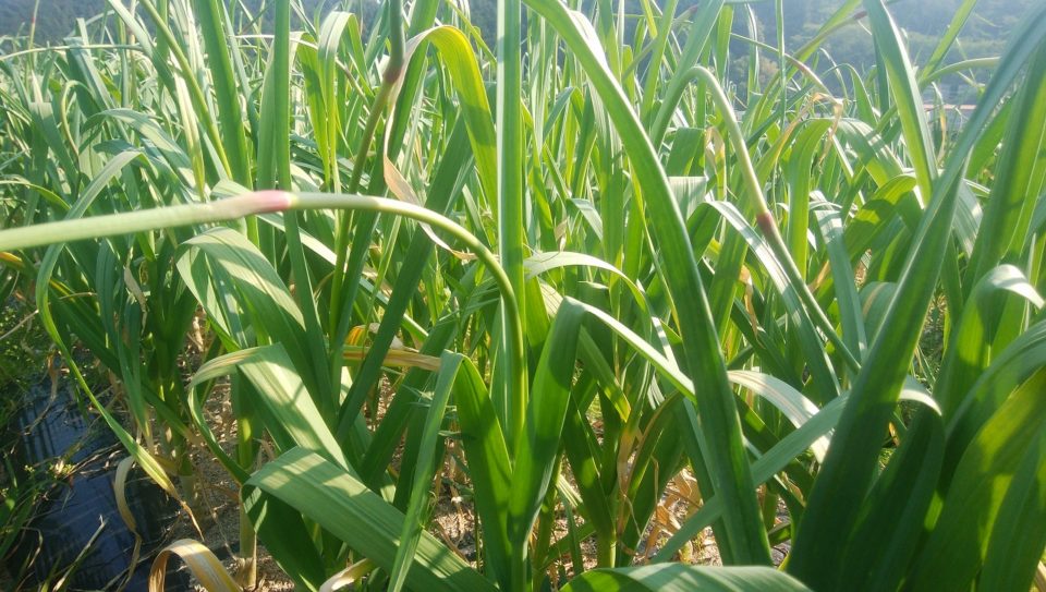昨年まではニンニクの芽が出ない品種を栽培してました。ずっと自家採種続けてた分なんですが、病気で全滅しかけたので、品種を一新しました。暖地系品種でニンニクの原種に近いと言われてる品種です。この品種はニンニクの芽がでるのでお得ですね。