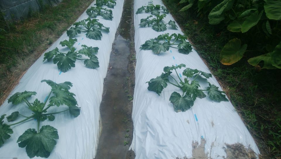 秋採りのズッキーニもぼちぼち育ってます。ウリ科なので水は合ったほうが良いので里芋に水を流し込むついでにズッキーニも水を流し込んでます。