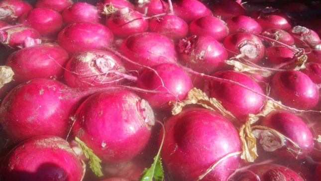 今週は赤カブ入ってます。発色がとてもキレイです。肉質も柔らかくてジューシー、生食や酢漬けがいい感じです。後は最近流行りの皮を手でむける品種です。くし切りにすると皮を手で向きやすくなります。皮を手でも向ける特性を生かして盛り付けを工夫すると良いと思います。