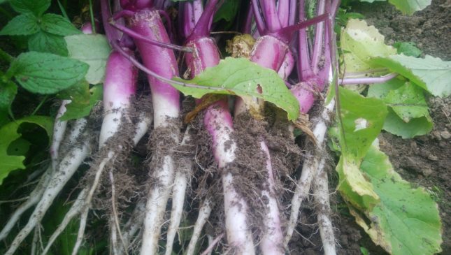 蕪が始まりました。写真は日野菜かぶです。今朝の収穫時、土からスッポと抜いくと蕪の匂いが香ります。思わず土を落として試食。良い感じです。日野菜かぶは独特の香りがあって、ぜひ鮮度の良いうちに独特の風味を味わって欲しいです。葉っぱは虫食いが目立つので落としてます。