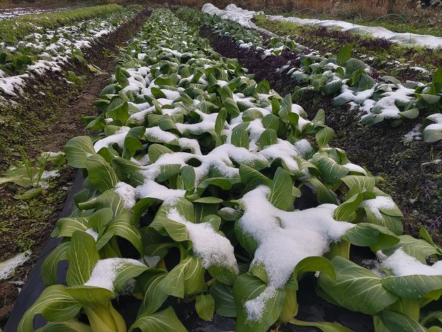 野菜が凍ってると収穫できないので、冬場は夕方収穫にしてます。しかし寒波が来たときは、夕方でもなかなか融けないので焦りますね。