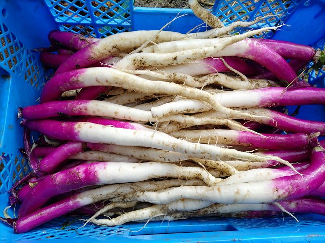 写真は日野菜かぶ。紅白でなんとなくめでたいかなと。滋賀の伝統野菜で歴史は古いです。お漬物が有名です。味はさっぱりというかスッキリしてるのでサラダで食べても美味しいと思います。赤い部分と白い部分を紅白で雑煮大根と金時人参の代わりにお雑煮に入れても良いかもしれません。