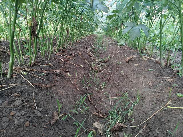 写真はオクラの畝。まだ腰くらいの高さなので収穫が大変。しゃがんで収穫は膝にきます。もう1,2週すると立って収穫できるくらいまでの高さになります。そうなれば収穫もだいぶ楽になります。