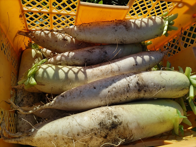 大根の収穫が始まりました。予定より2週間早いです。今年は暑いからだと思います。例年は10月中頃で最高気温20度を下回るのですが、今年は11月2週目くらいになりそう。そんな気温なんで大根の収穫も早いです。種まきが9月の上旬分で気温が高すぎて発芽不良が多かった分なので数が少なくて中セット以上で入れさせて頂いてます。5日経っても芽がでなかったので、すぐ蒔きなおしたのでその分が11月からは収穫できると思います。来週辺りからは皆さんまに大根入れれると思います。