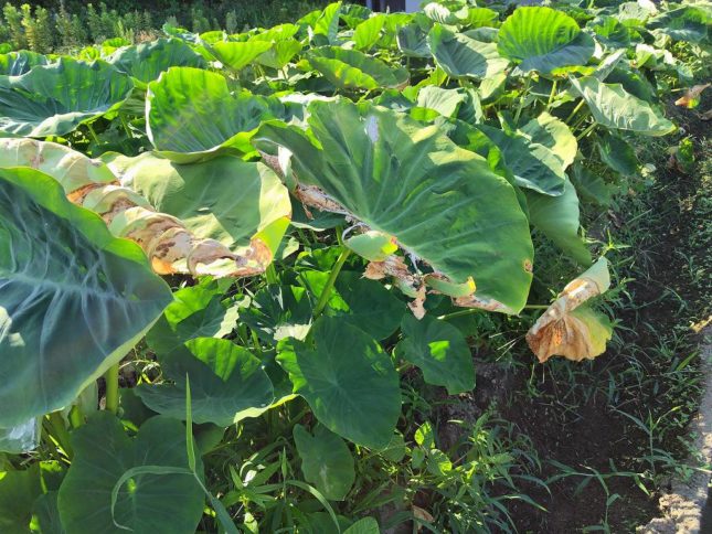 暑い日が続きます。雨もないので色々と大変です。この頃は夕立もめっきり少なくなってる気がします。豊富だった用水路の水もだんだん減ってきたので、夏を無事乗り切れるか心配です。写真は里芋の畑、ギリギリ水が足りてるので葉の痛みも少ないほうです。里芋は水が足りなくなると葉がバタバタ枯れて生育不良に水やりに気を使う野菜です。用水路の水量が減ると水やりが大変になるので一雨欲しいところです