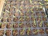今年は畑の土を基本とした育苗土、苗と一緒に雑草もちらほら生えてきます。