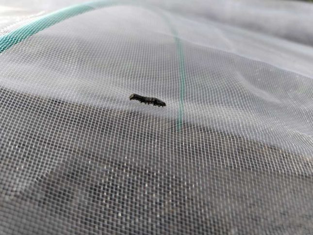 葉物は壊滅的なダメージを受けたものが多々、9月蒔きの物がほぼ本葉1,2枚出るまでにすべて食べられてるといった状況です。ヨトウムシは親が飛んで来て葉に卵を生んでグワッと広がるイメージだったんですが、今年のヨトウムシは幼虫が歩いてきます。上の写真の様な感じで防虫ネットの上を沢山歩いてます。何処か隙間があればか、1mm以下の大きさのときに防虫ネット中に入ってきます。
