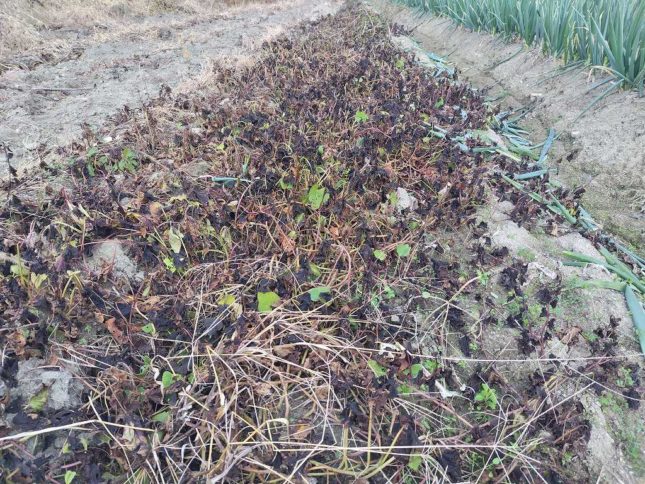 氷点下以下になって畑の色も少し変化してます。寒さに弱い植物は一気に凍害で傷んで茶色になります。写真はさつまいもの畑を掘り起こした後地ですが、先週まではツルや葉が青々としてたんですが、一気に枯れてます。