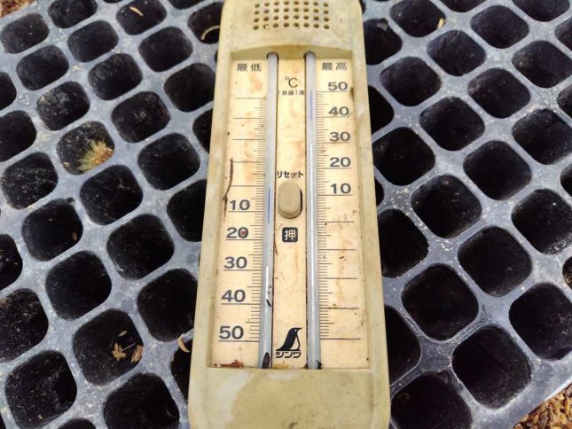 最高最低温度計の左側の青い棒が最低温度の記録棒です。