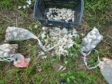 にんにくの1片、一片を穴の中に入れていって終了と行きたかったですが、やっぱり土の硬さが気になったので、その上から、近所の植木屋さんに頂いた、刈草や剪定枝を細かくチップにした物を乗せておきました。